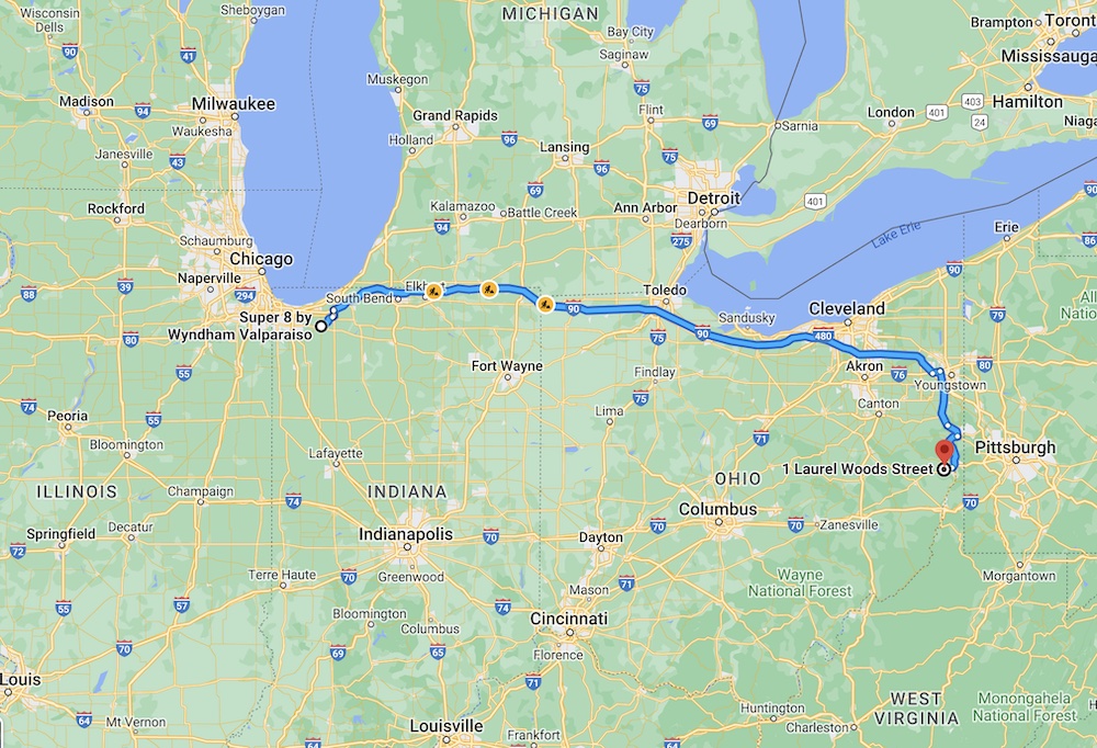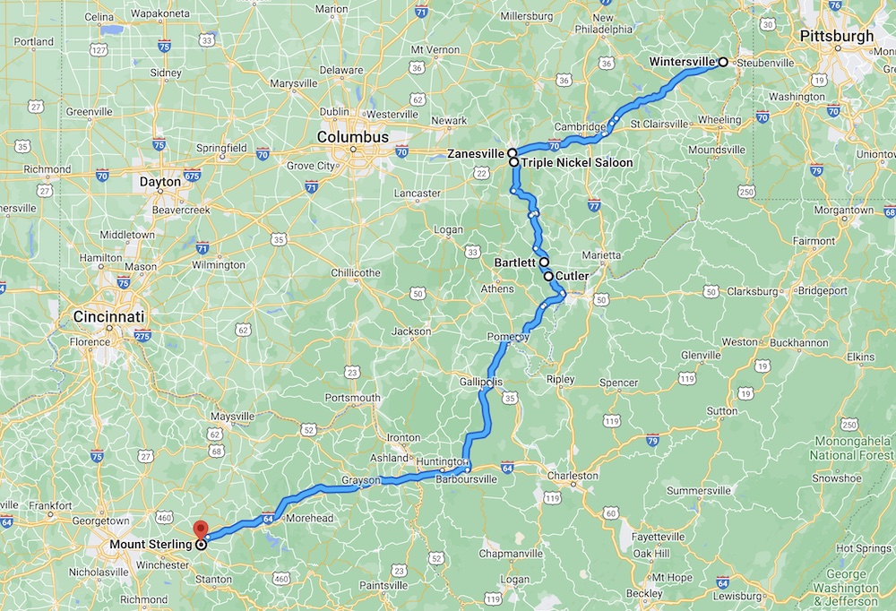 It’s that time of year to visit Mandi’s family in Wintersville, OH. In order to make that happen on a bike, requires me to ride out to ahead of time and meet her at the Pittsburgh Airport. To accomplish that I break the trip into 400 or so miles a day, so it takes me a good 6 days to get out there. Below are the mapping of my trip out, as I don’t have any pictures to share, but may in the future have some video of the trip…